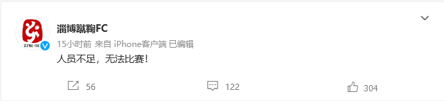 中甲官宣:淄博蹴鞠因人员不足弃赛,被判0比3负