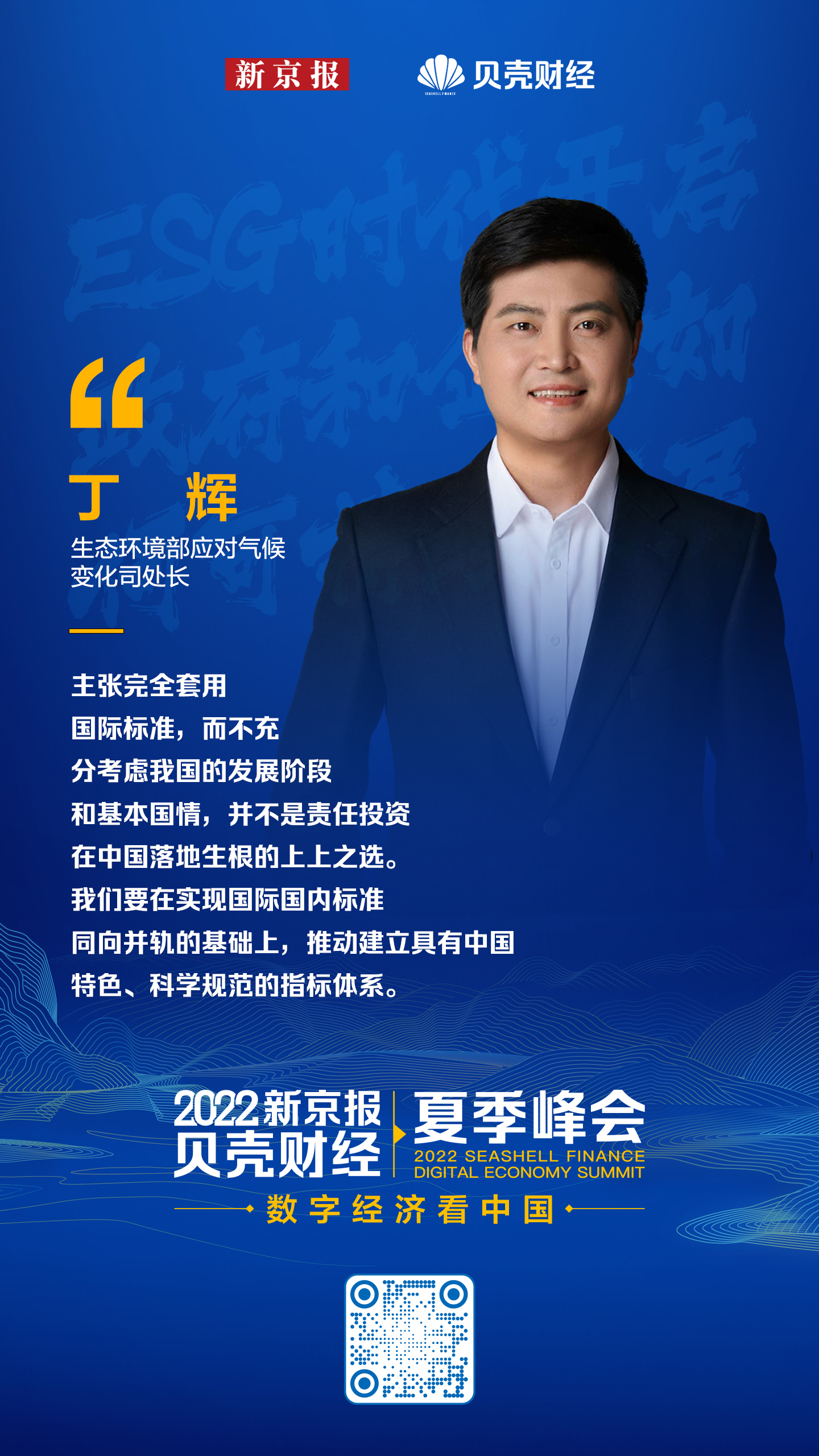 8月3日,2022新京报贝壳财经夏季峰会“先立后破,双碳助力美丽中国”主题论坛以在线形式举行。生态环境部应对气候变化司处长丁辉在“中国ESG投资的前景与挑战”环节,发表主题演讲。