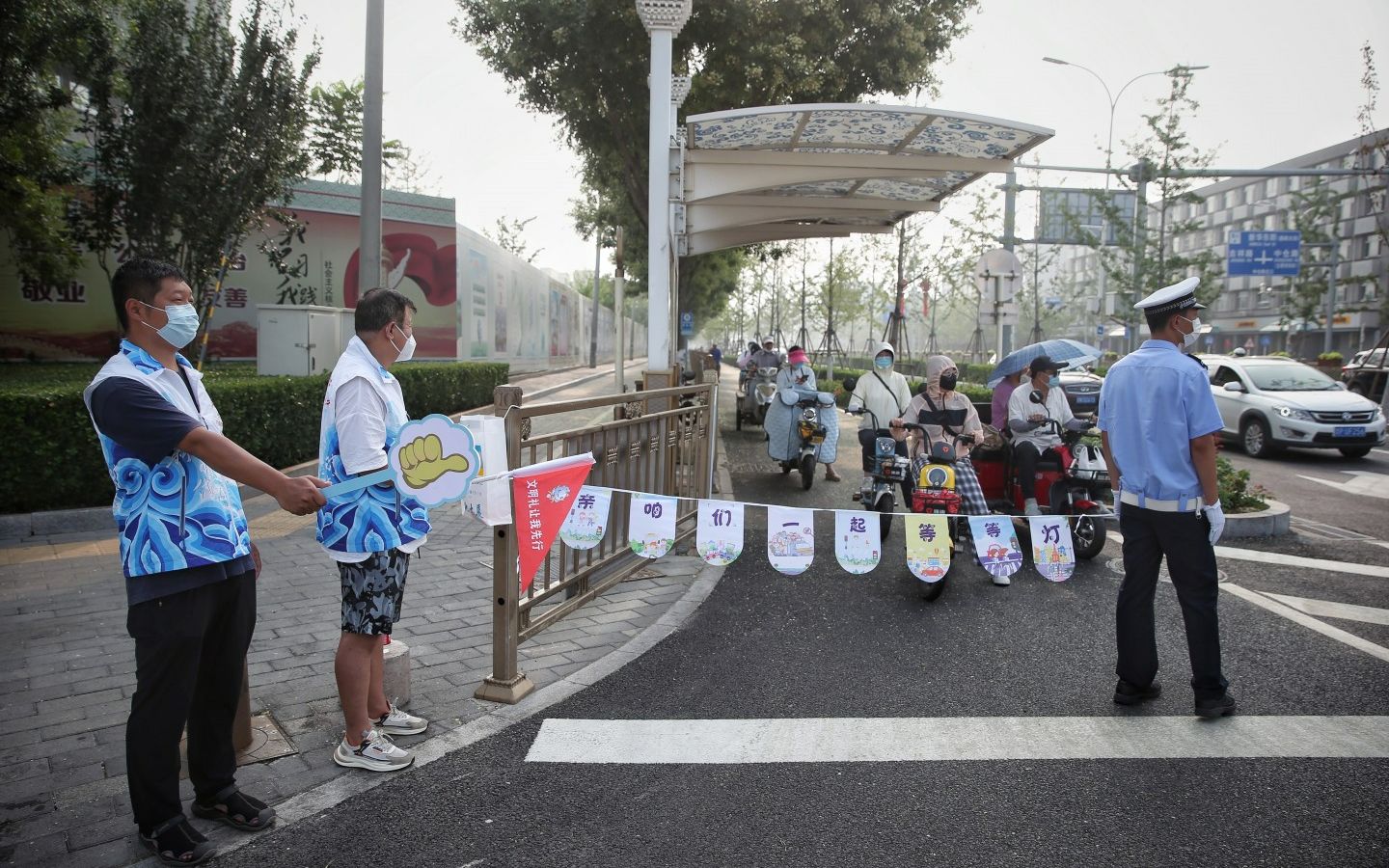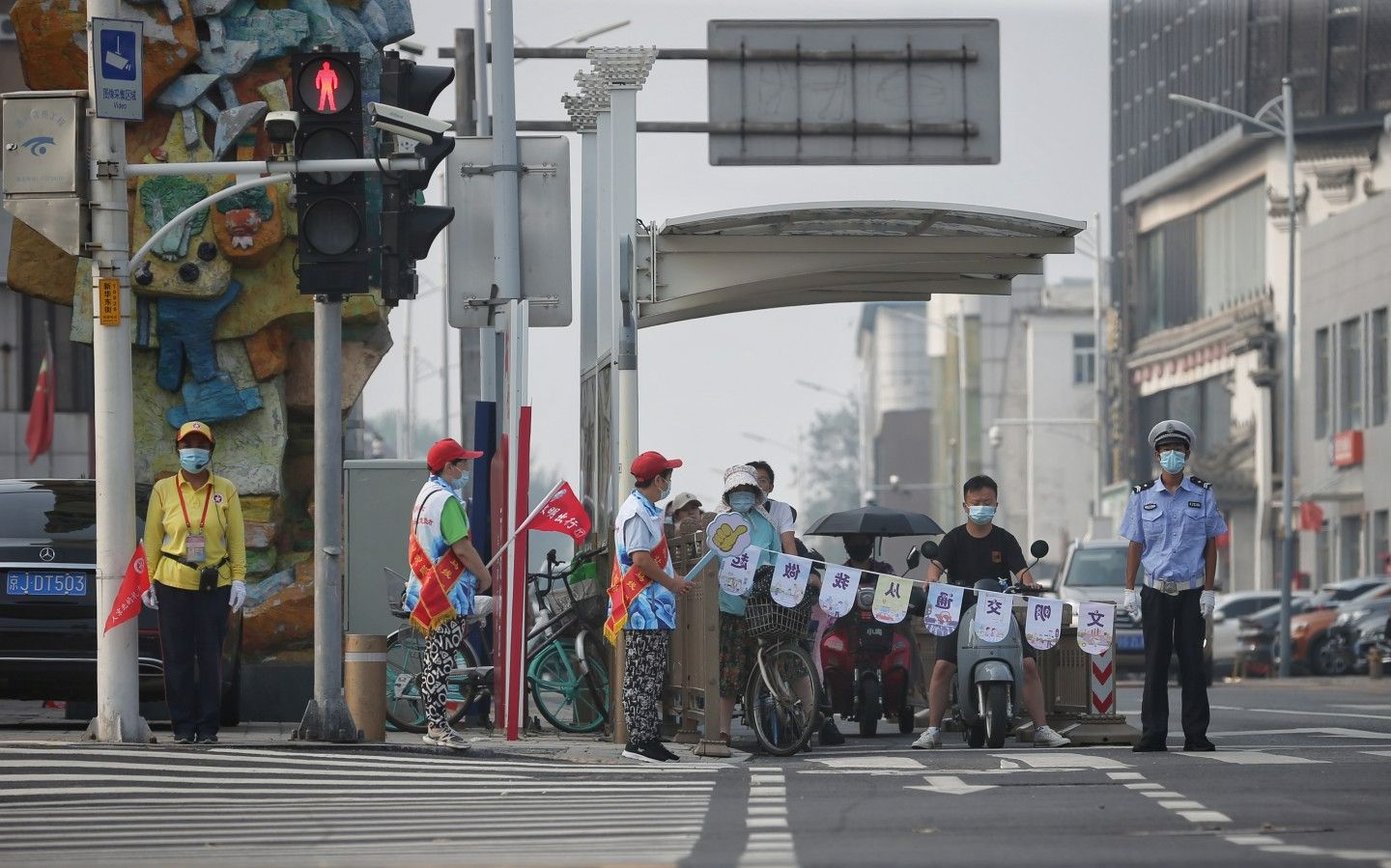 8月2日,通州新华东街,志愿者、交警在路口值守。新京报记者 薛珺 摄