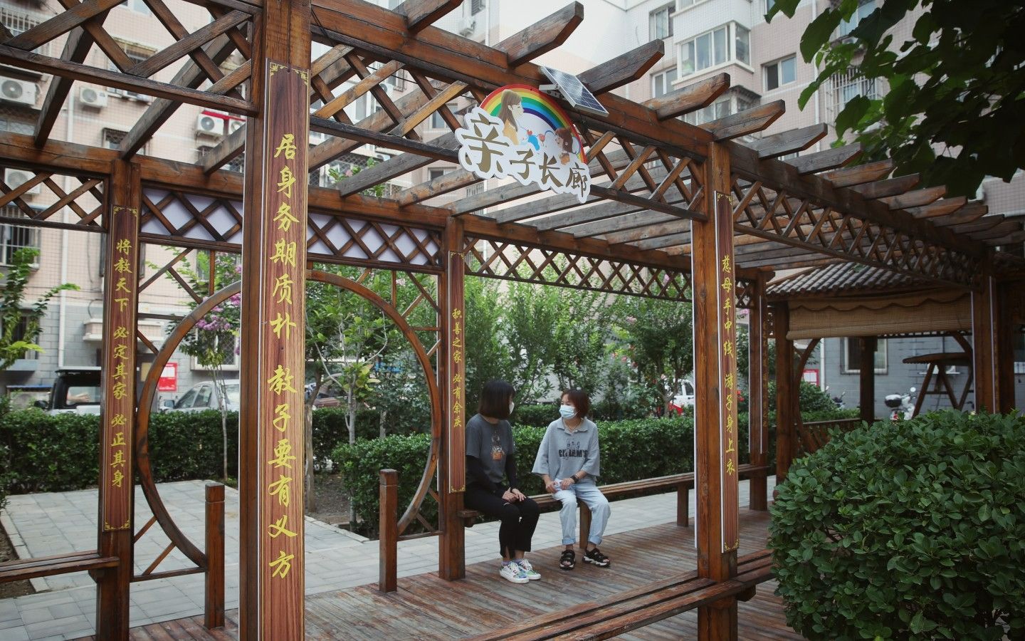 8月2日,中仓街道中上园5号院,居民在亲子长廊聊天。新京报记者 薛珺 摄