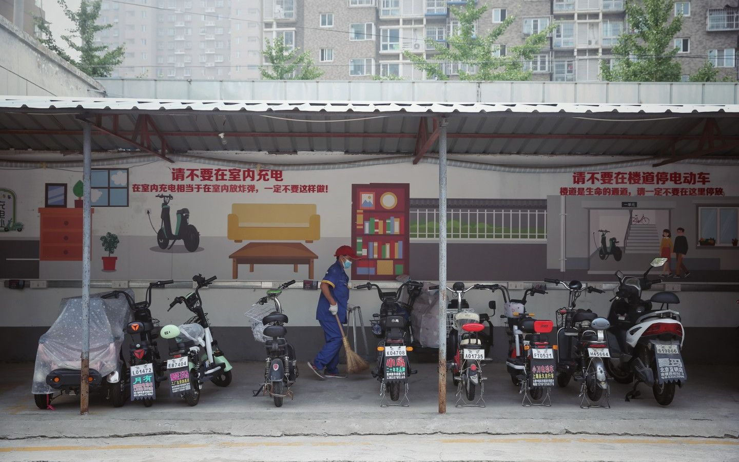 8月2日,中仓街道中上园5号院,电动车车棚内随处可见安全提示。新京报记者 薛珺 摄