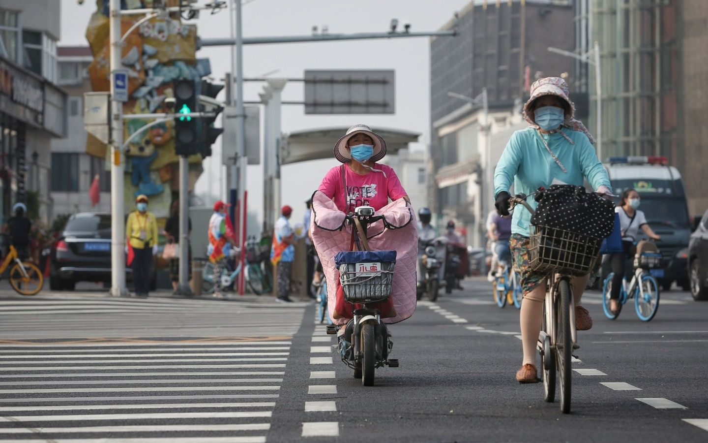 8月2日,通州新华东街,两位骑行者“全副武装”过马路。新京报记者 薛珺 摄