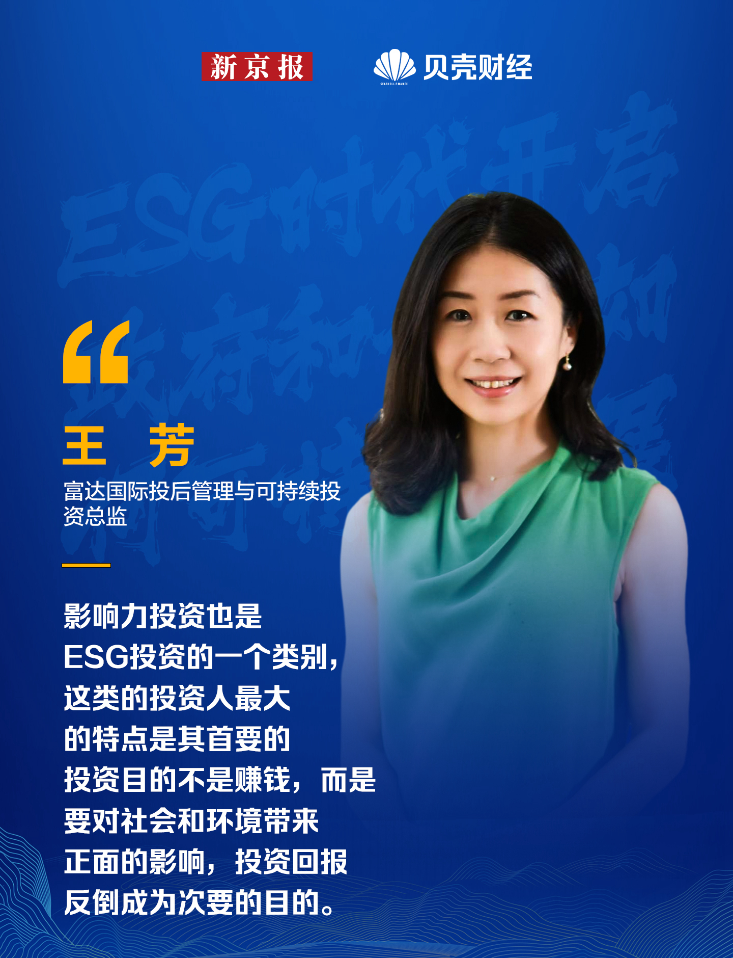 8月2日,2022新京报贝壳财经夏季峰会正式开幕。在本次峰会“中国ESG投资的前景与挑战”分论坛上,富达国际投后管理与可持续投资总监王芳指出,ESG投资背后的动机就是越来越多的投资人希望自身的投资行为对环境和社会带来正面的影响。阅读全文>>>