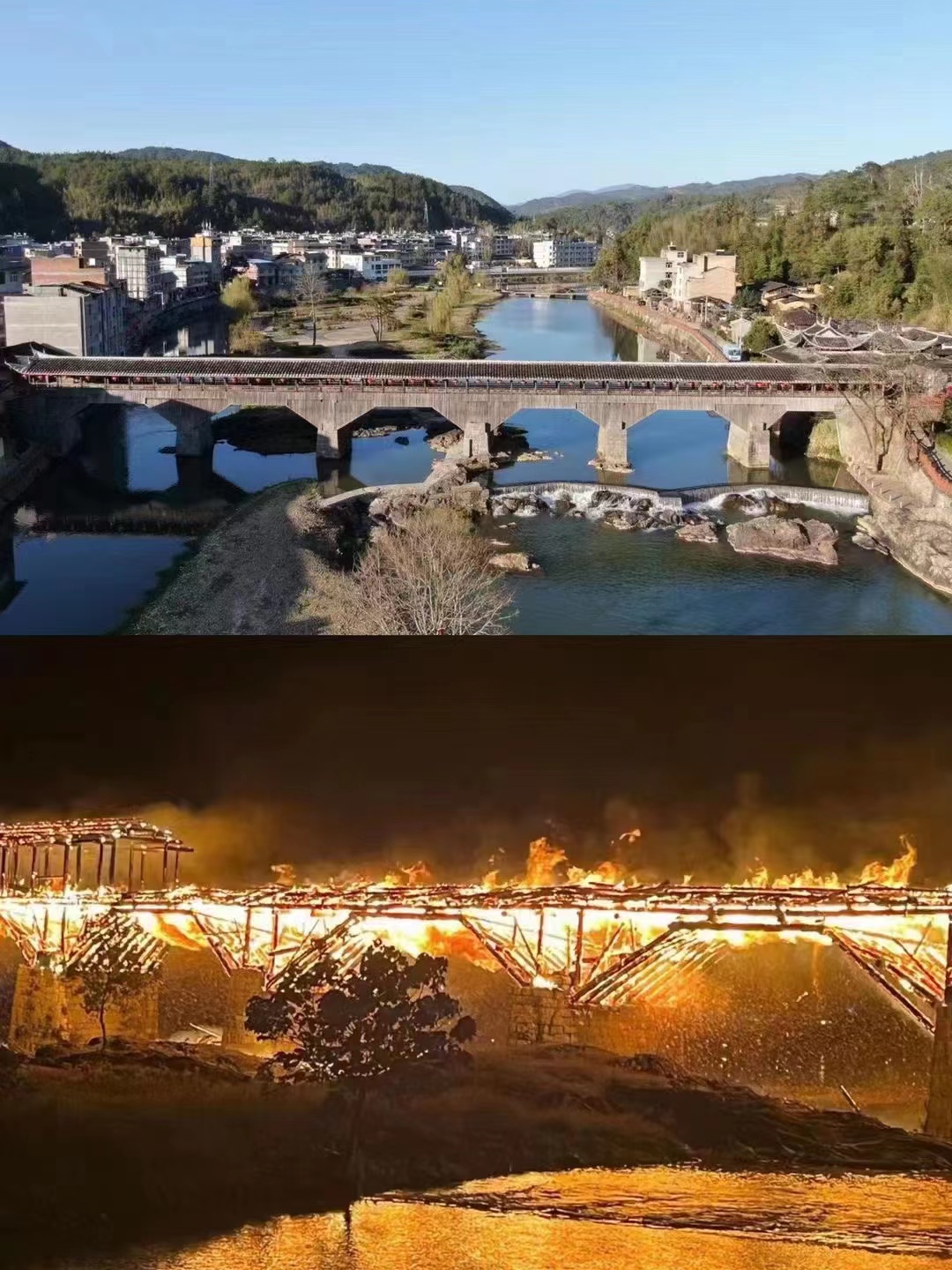 万安桥火灾前、火灾中对比。受访者供图