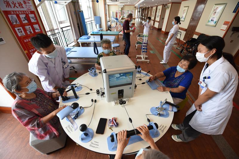 ▲8月5日,在山东日照颐养公寓,医生指导老人通过手功能综合康复训练平台进行手指锻炼。图/新华社