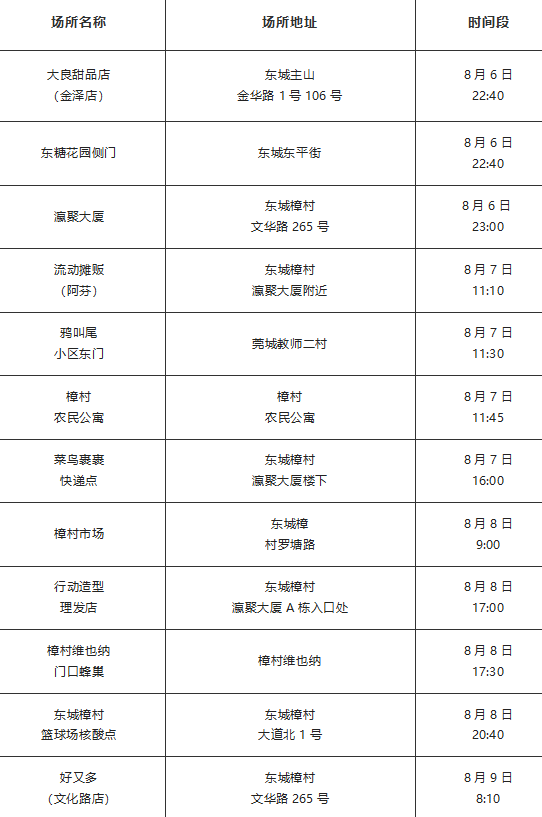 据央视新闻消息,8月9日,广东省东莞市东城区发现1例外省返莞人员新冠肺炎初筛异常个案。请到过以下场所的市民立即向所在社区报备并前往就近的核酸检测采样点进行核酸检测。