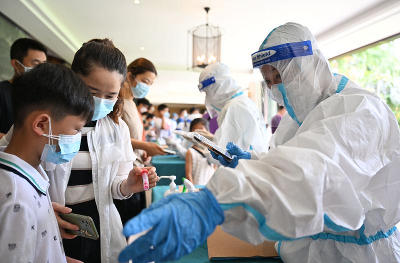 ▲8月9日,来自山西晋城的游客张维(右一)在三亚市一家酒店为游客进行核酸信息采集。图/新华社