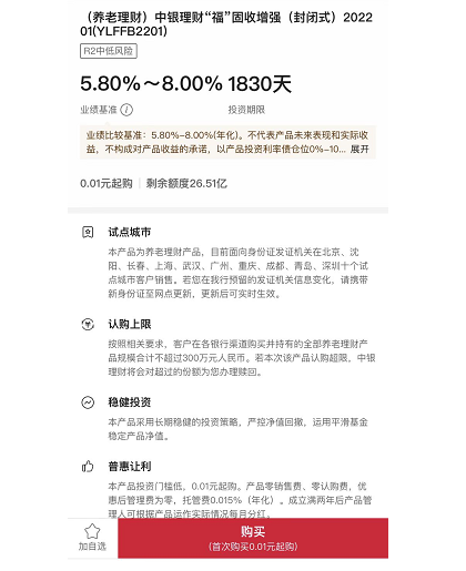新京报贝壳财经记者在中国银行手机APP上查看到,截至记者发稿时,中银理财于8月8日发行的养老理财产品的剩余额度为26.51亿元,剩余不到该产品总发售量60亿元一半的规模。