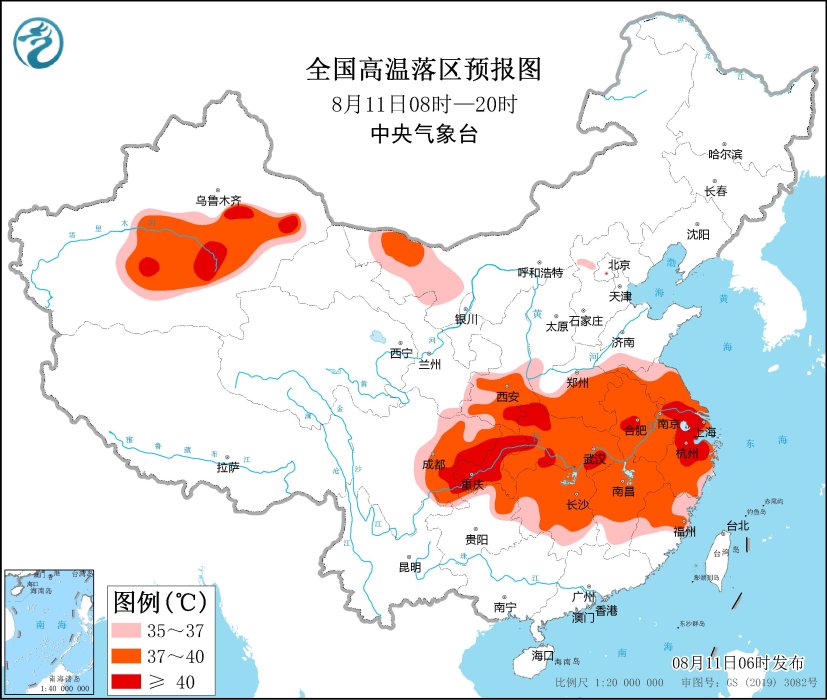 预计8月11日白天,新疆南疆盆地、内蒙古西部、陕西中南部、河南中南部、安徽、江苏、上海、四川中东部、重庆、湖北、湖南、江西、浙江、福建中北部、贵州北部等地有35~39℃高温天气,其中,陕西东南部、湖北西部和南部、四川东部、重庆、江苏南部、安徽中部、浙江北部等地的部分地区可达40℃以上。
