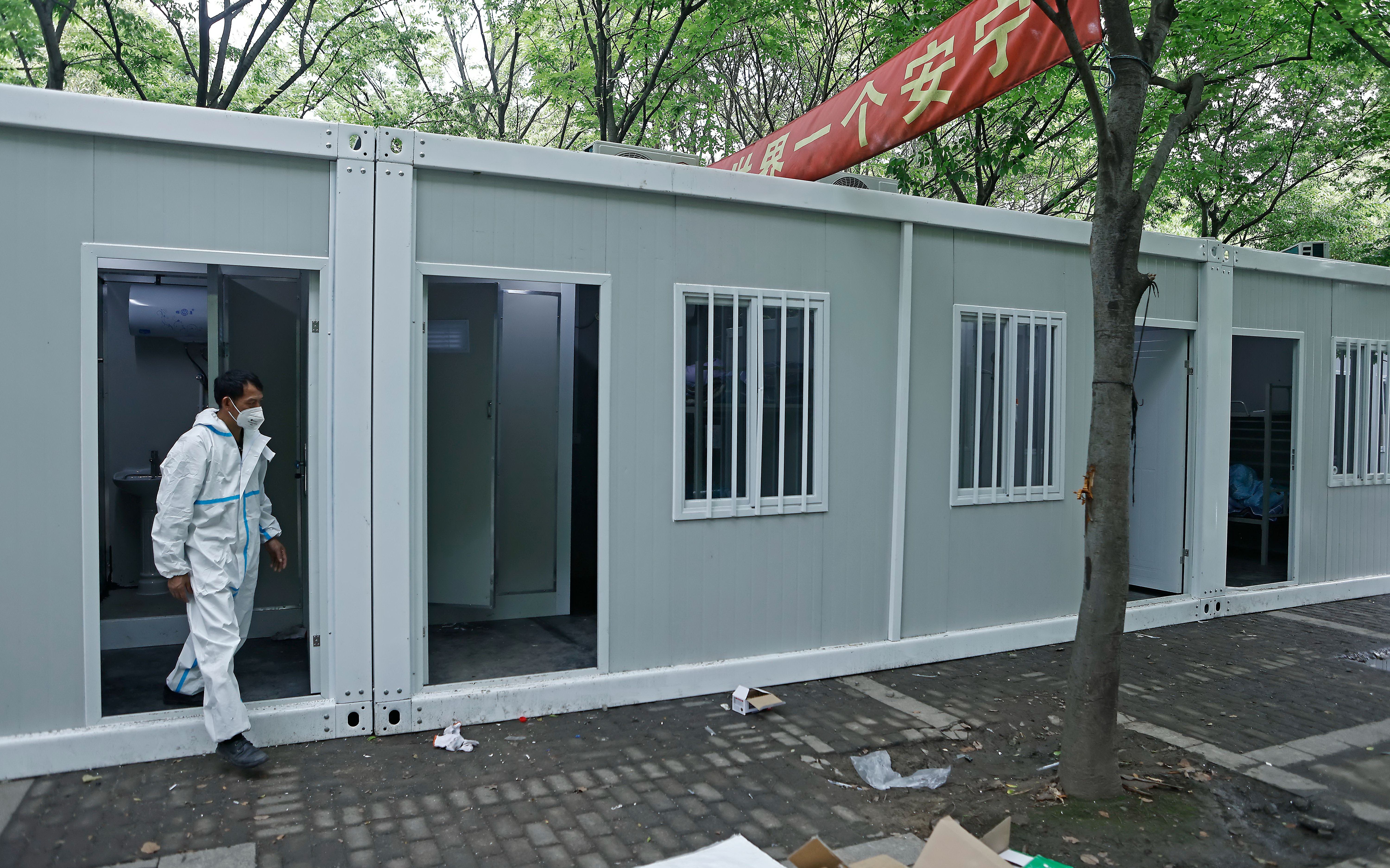 4月28日,上海宝山,在泗塘篮球公园集中隔离点,工作人员正在查看各房间内的设备。殷立勤 摄/IC photo