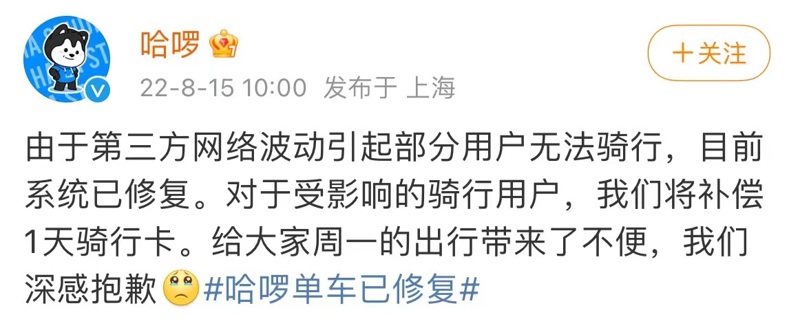 新京报讯 据@哈啰消息,由于第三方网络波动引起部分用户无法骑行,目前系统已修复。对于受影响的骑行用户,哈啰将补偿1天骑行卡。