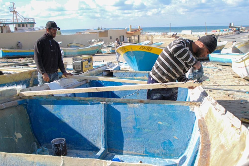 2021年12月22日,巴勒斯坦工人在加沙城一港口维修渔船。新华社发(里泽克·阿卜杜勒·贾瓦德摄)