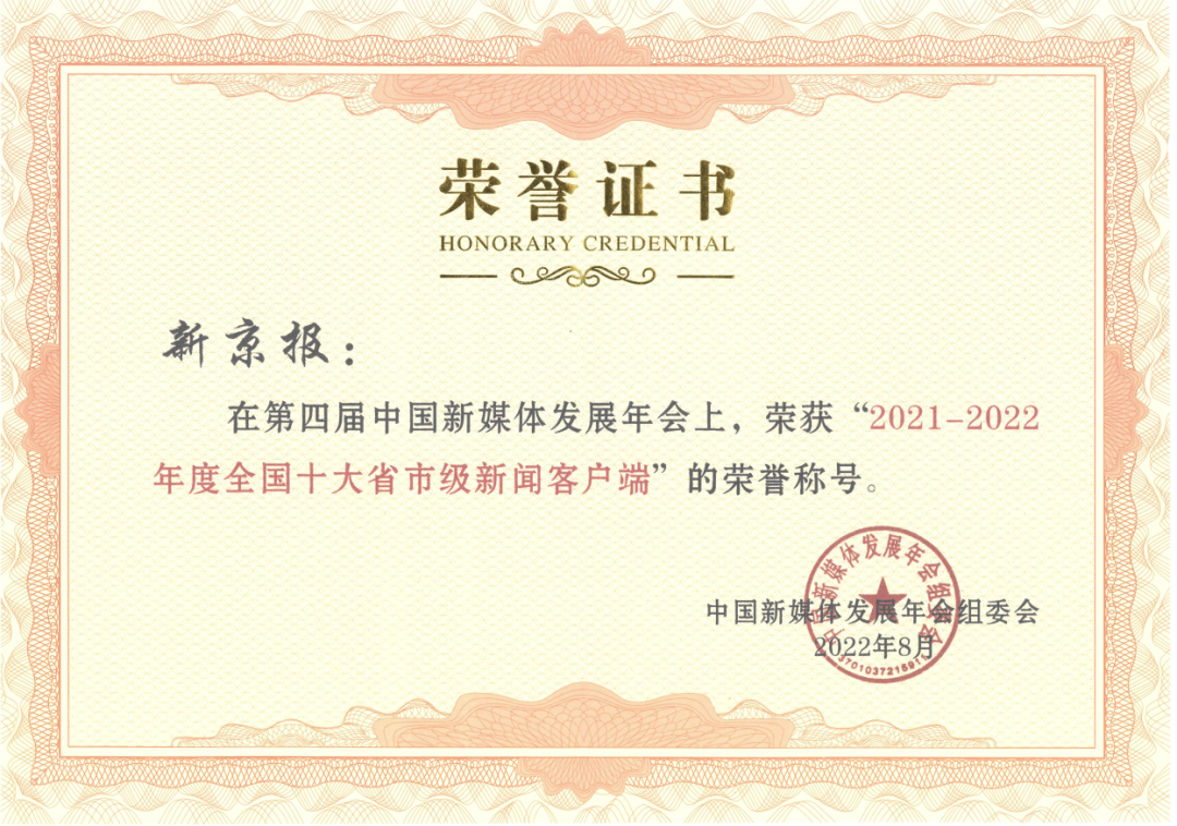 8月22-23日,第四届中国新媒体发展年会在山东省济南市举行,中国新媒体发展年会排行榜揭晓,新京报获颁“2021-2022年度全国十大省市级新闻客户端”称号。