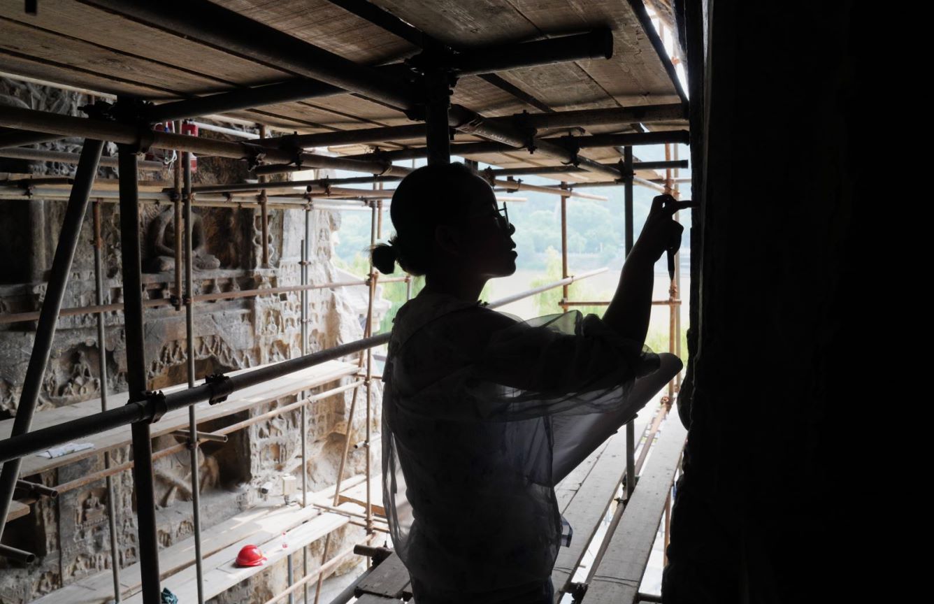 7月29日,奉先寺前的脚手架已拆除大半。古阳洞里,龙门石窟研究院历史人文研究中心的李晓霞和几个年轻女同事正站在架子上做考古调查报告的文字记录部分,“这项工作要求我们将现场看到的自然裂隙、崩塌、风化和人为的盗凿、保护修复、古代的雕刻遗迹等都要全面、全方位、无差别地进行记录。”