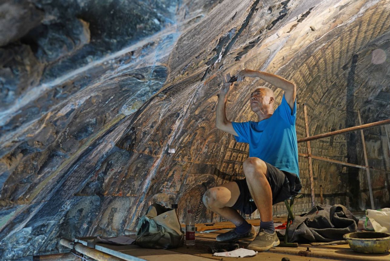 67岁的老石匠刘建设是龙门石窟研究院唯一一位两次参与奉先寺大修的保护者,对龙门石窟东西两山现存的2800多个窟龛,可谓烂熟于心。