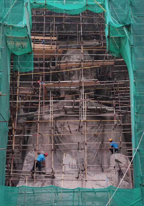7月下旬,施工人员在拆除卢舍那大佛前的脚手架。新京报记者陈杰 摄