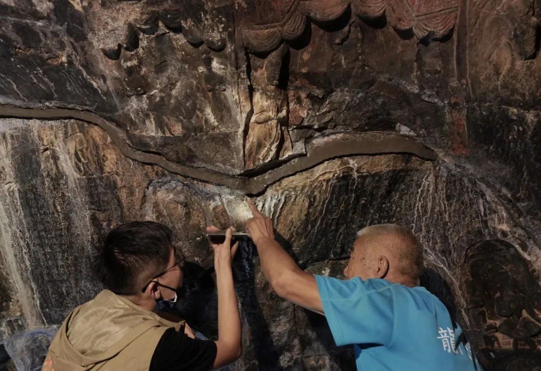 马朝龙的手机里有一段雨中拍摄的卢舍那大佛左侧胁侍,头戴花蔓冠的文殊菩萨右上方有处裂隙喷水的视频,飞溅的水花从菩萨的右脸直流而下,在胸前的璎珞上弹起再跌落,最终洒满一身裙裾。“如果不是下雨天,对于沿着岩体裂隙出现的小量渗水,不进行压水试验我们很难发现渗水处”。