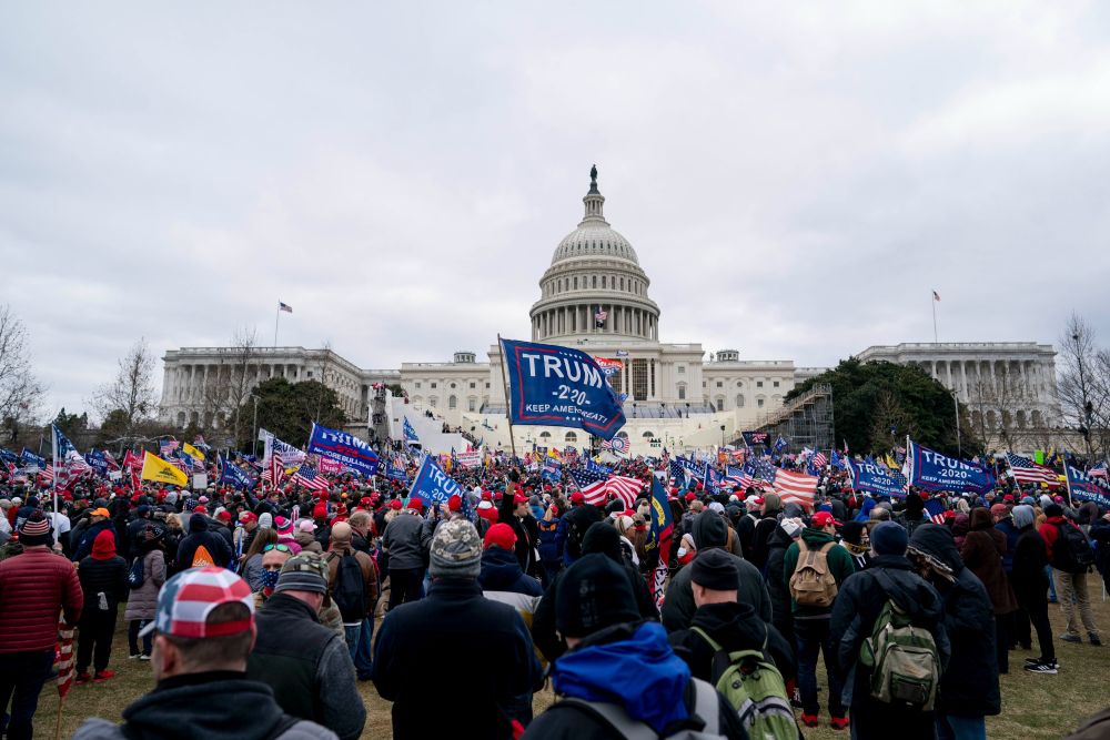 2021年1月6日,在美国首都华盛顿的国会大厦前,时任总统特朗普的支持者举行示威游行。部分示威者冲击国会大厦并与警方发生冲突,导致参众两院认证大选结果联席会议中断数小时,4名示威者和1名国会警察死亡。新华社记者刘杰摄