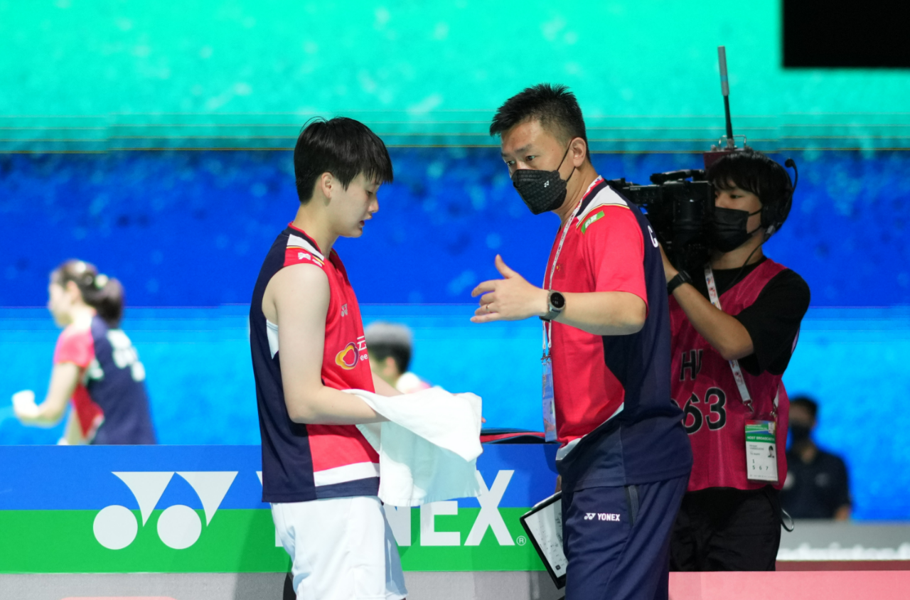 陈雨菲(左)在比赛间隙接受教练指导。 新华社记者 张笑宇 摄