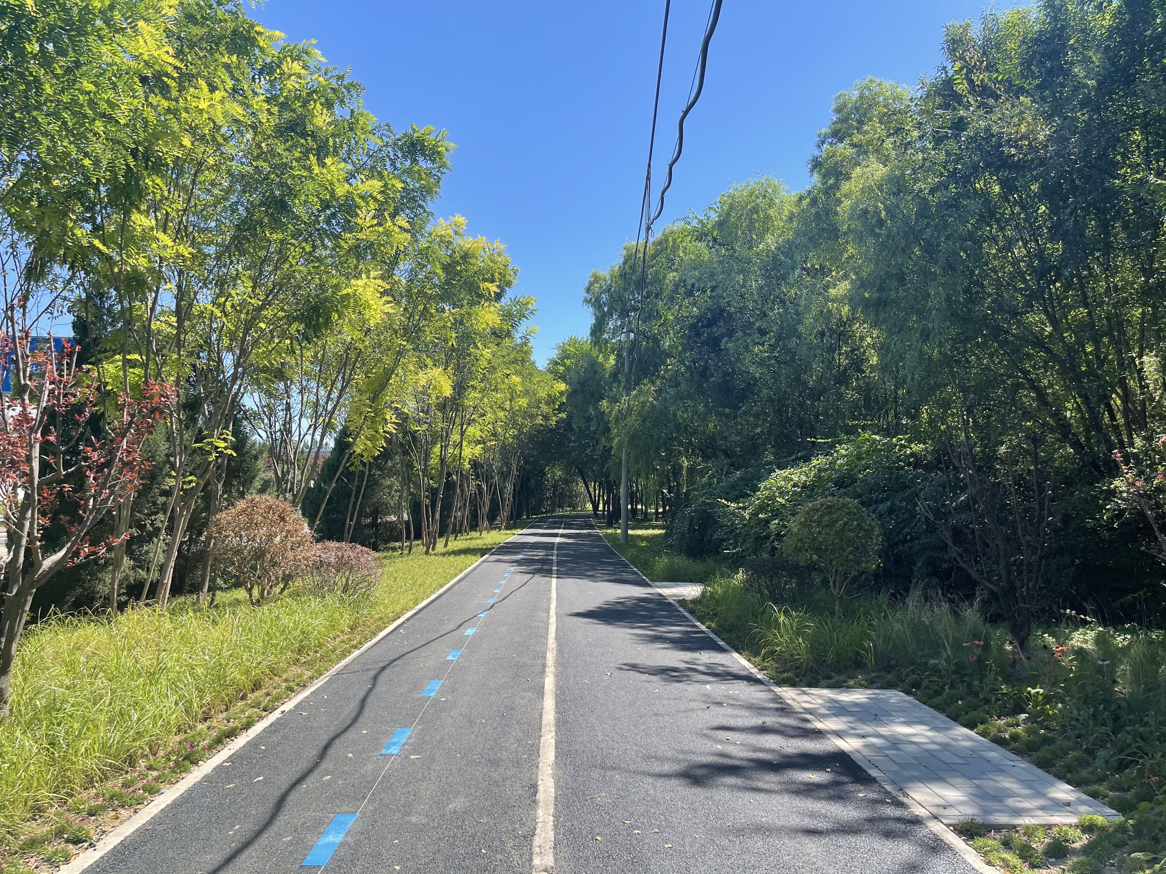 仰山公园旁藏着一条幽静的林荫绿道,绿道分为步行道和骑行道,虽然不算宽,但无论是骑行还是漫步都足够,且互不干扰。小道旁种满了白杨树,树下绿草茵茵、鲜花绽放。京城已进入秋季,在绿道上骑行更觉得舒适、凉爽。