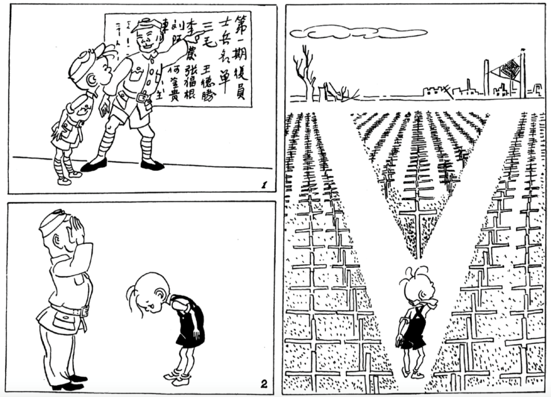 张乐平,《三毛从军记》之最后一帧(来源《申报》1947年10月4日第12版)。图片出自书中《儿童中国:三毛传奇》一文。本文作者认为,“三毛故事是现代中国人主体性变迁的重要图像叙述之一”,儿童成为一个现代性的代表。