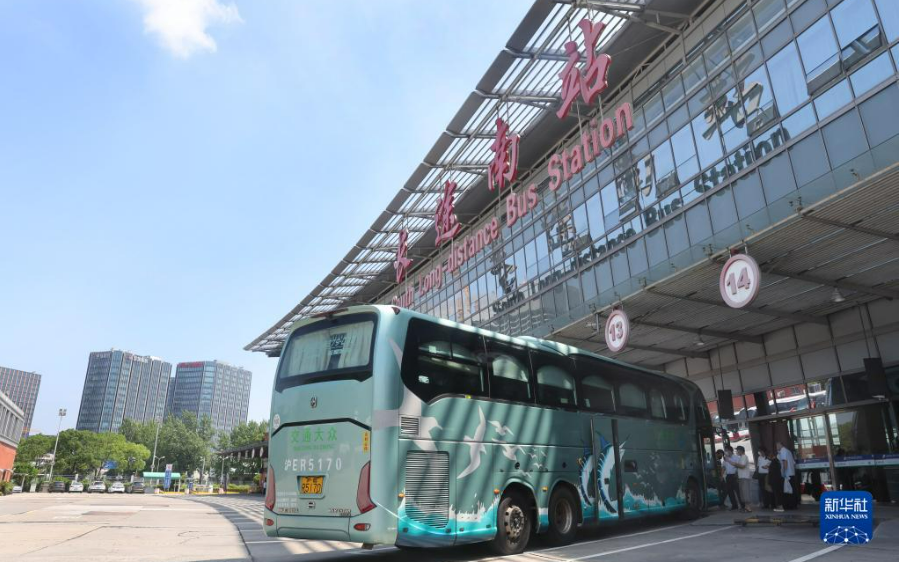 ▲7月5日,在上海长途客运南站,一辆客车停靠在检票口外等待旅客登车。图/新华社