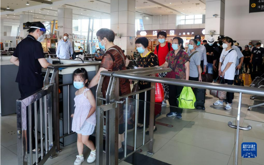 ▲7月5日,在上海长途客运南站,旅客在检票口检票乘车。图/新华社