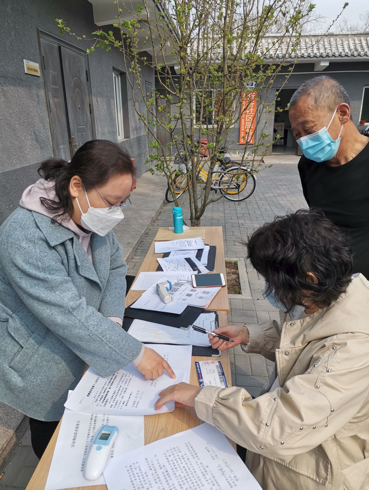 疫情期间,罗胤(左一)冲在疫情防控一线,指导居民报备相关防疫信息。受访者供图