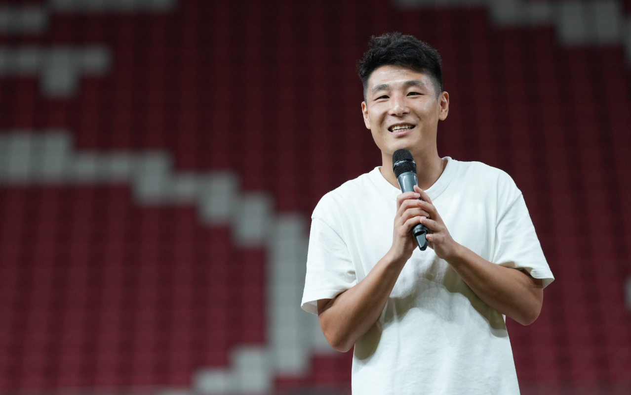 武磊在见面会上发言。 新华社记者 丁汀 摄