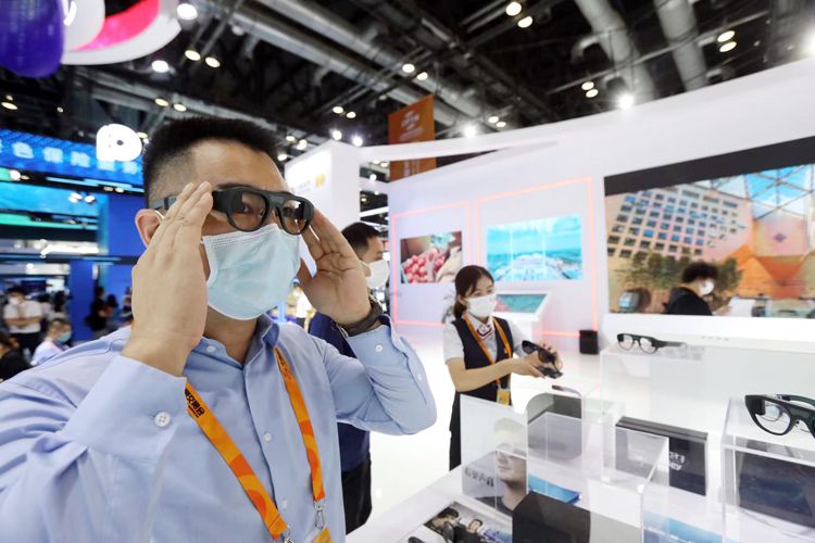 9月1日,国家会议中心二期展馆,中国银行展区展出帮助听障人士的AR字幕眼镜。今年服贸会首次启用国家会议中心二期展馆,在这里开设各省份专题展和今年新增的环境服务专题展。