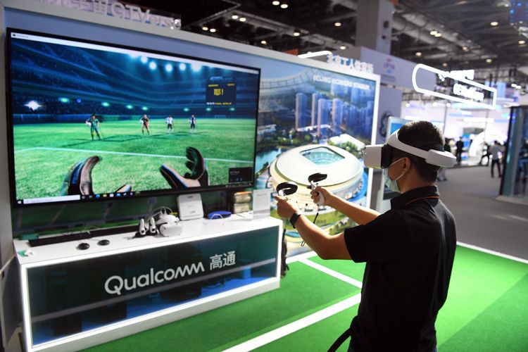 9月1日,国家会议中心一期展馆,观众在高通展台5G设备支持下的“工体元宇宙”体验踢足球。