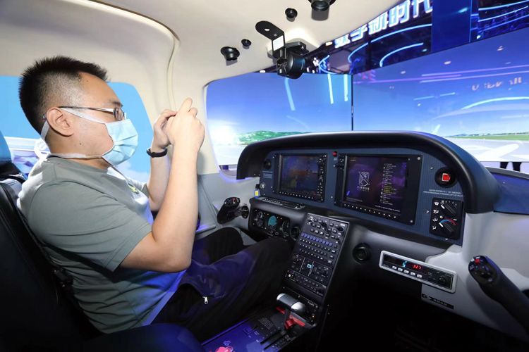 9月1日,国家会议中心二期展馆,河南省展区参展代表体验模拟驾驶飞机。