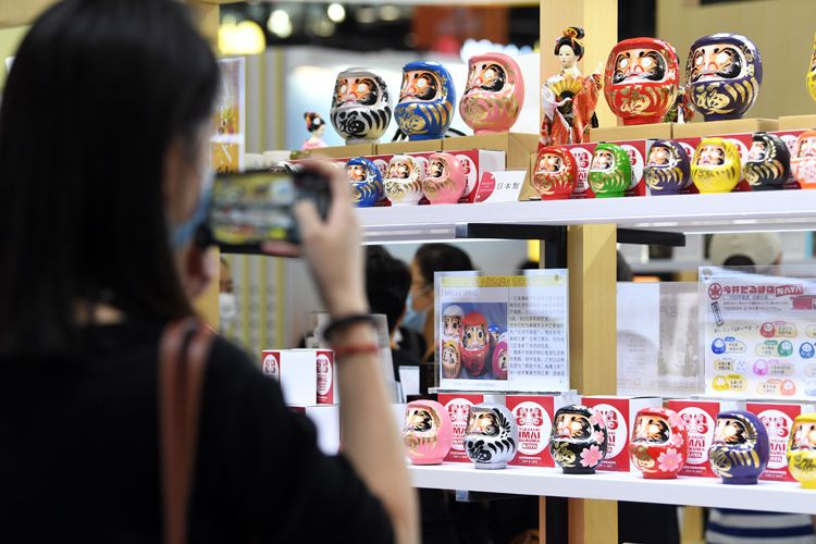 9月1日,国家会议中心一期展馆,观众在日本展区拍摄工艺品。