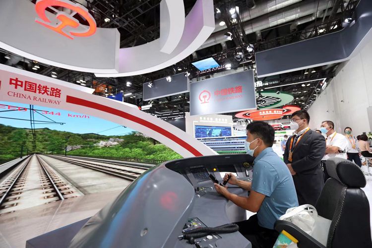 9月1日,国家会议中心一期展馆,观众体验驾驶“复兴号”动车组。