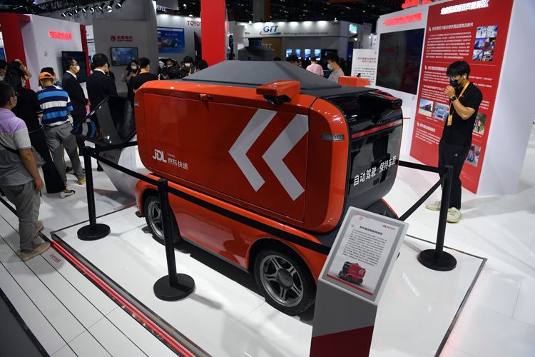 9月1日,国家会议中心一期展馆,京东物流智能快递车。
