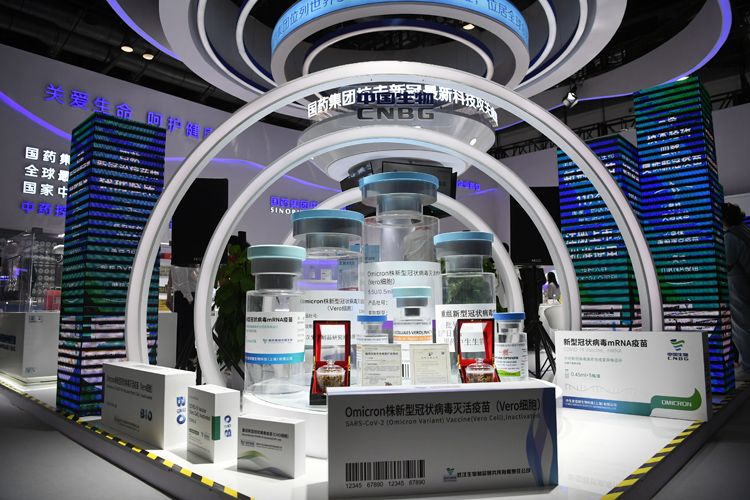 2022年服贸会综合展设在国家会议中心一期展馆,布展面积达2.1万平方米。图为国药集团抗击新冠最新科技攻关成果展示。
