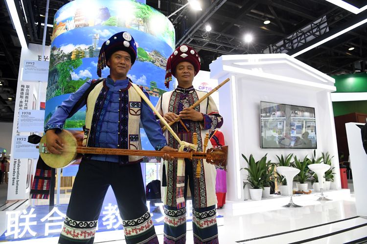 9月1日,国家会议中心一期展馆,少数民族演员在联合国教科文组织展区前表演传统乐器。
