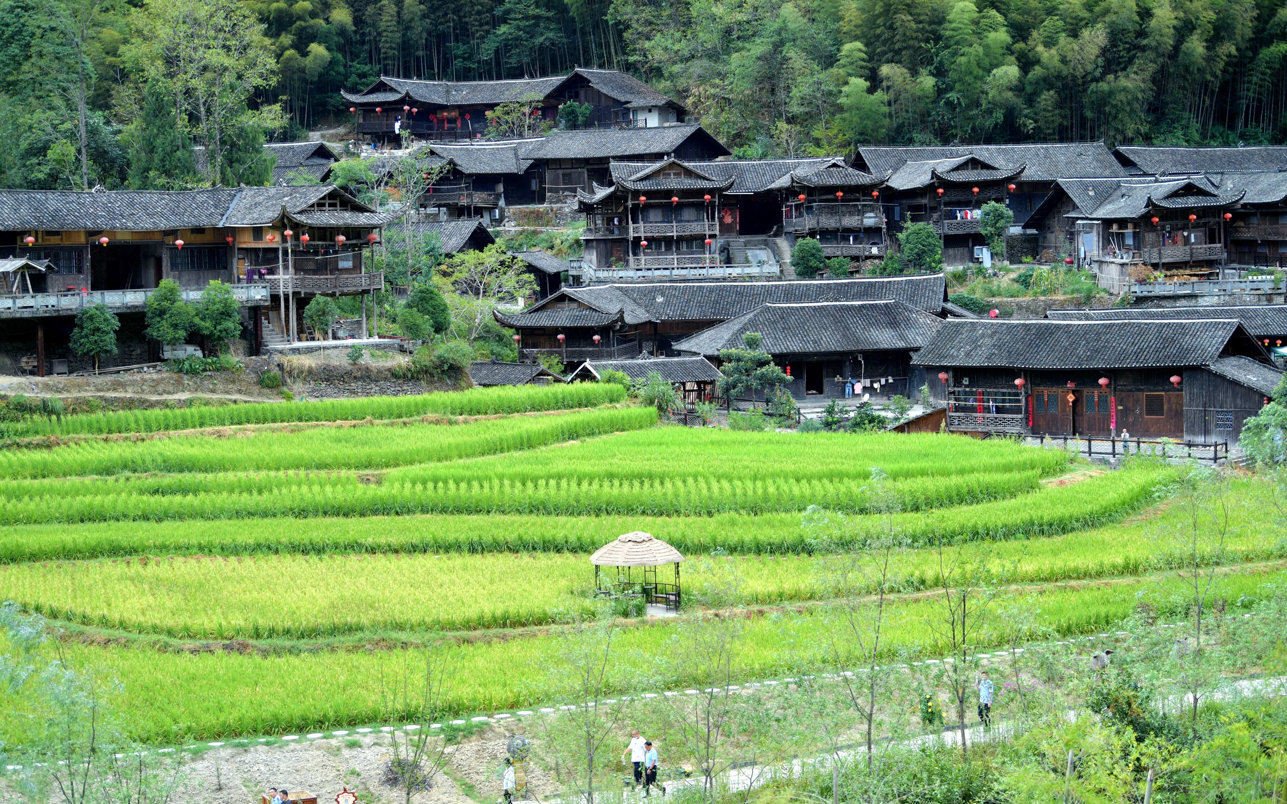 ▲传统村落,古色古香的吊脚楼与起伏的田垄勾勒出一幅迷人的画卷。图/新华社