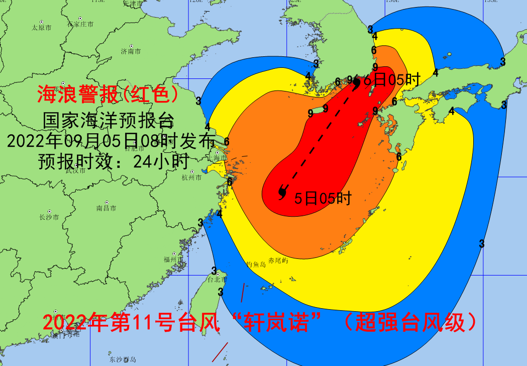 受今年第11号台风“轩岚诺”(超强台风级)的影响,海浪方面,预计9月5日中午至6日中午,东海将出现7-11米的狂浪到狂涛区,黄海南部将出现4-7米的巨浪到狂浪区,近海海域海浪预警级别为橙色。