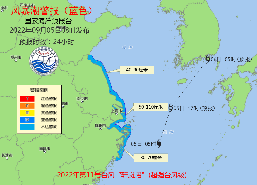 风暴潮方面,预计9月5日上午到6日上午,江苏连云港至盐城沿海将出现40-90厘米的风暴增水,江苏南通至杭州湾沿海将出现50-110厘米的风暴增水,浙江台州沿海将出现30-70厘米的风暴增水。上述岸段内的潮位站将不会出现达到当地蓝色警戒潮位的高潮位。风暴潮预警级别为蓝色。