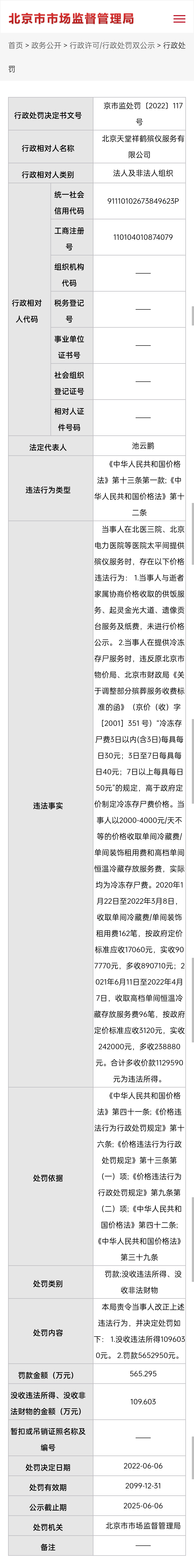 近期,在北京市市场监管局网站上公布的行政处罚决定书显示,涉事公司北京天堂祥鹤殡仪服务有限公司,因价格违法,被没收违法所得109万余元,罚款565万余元。