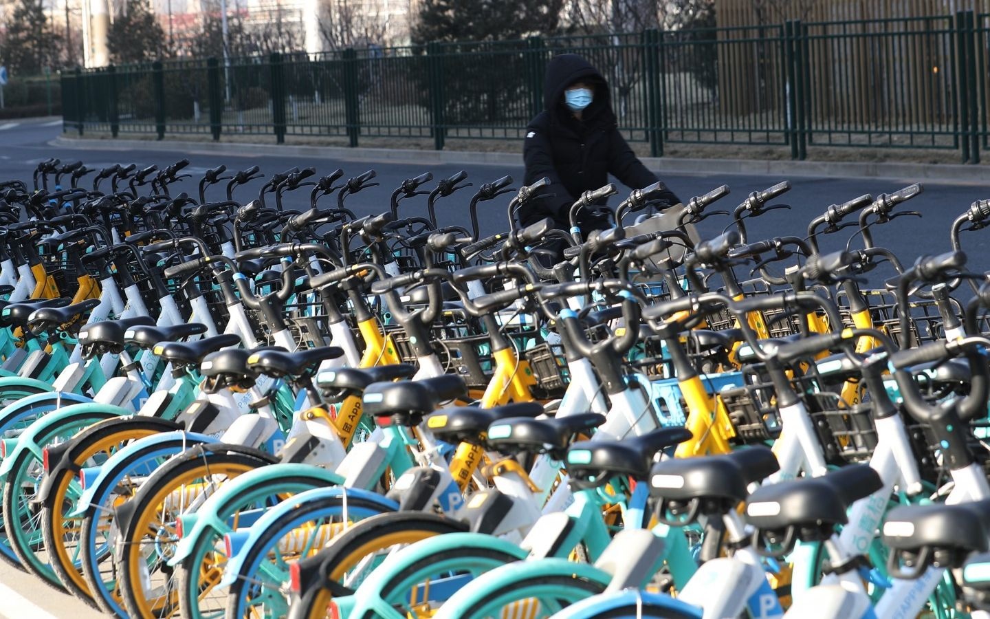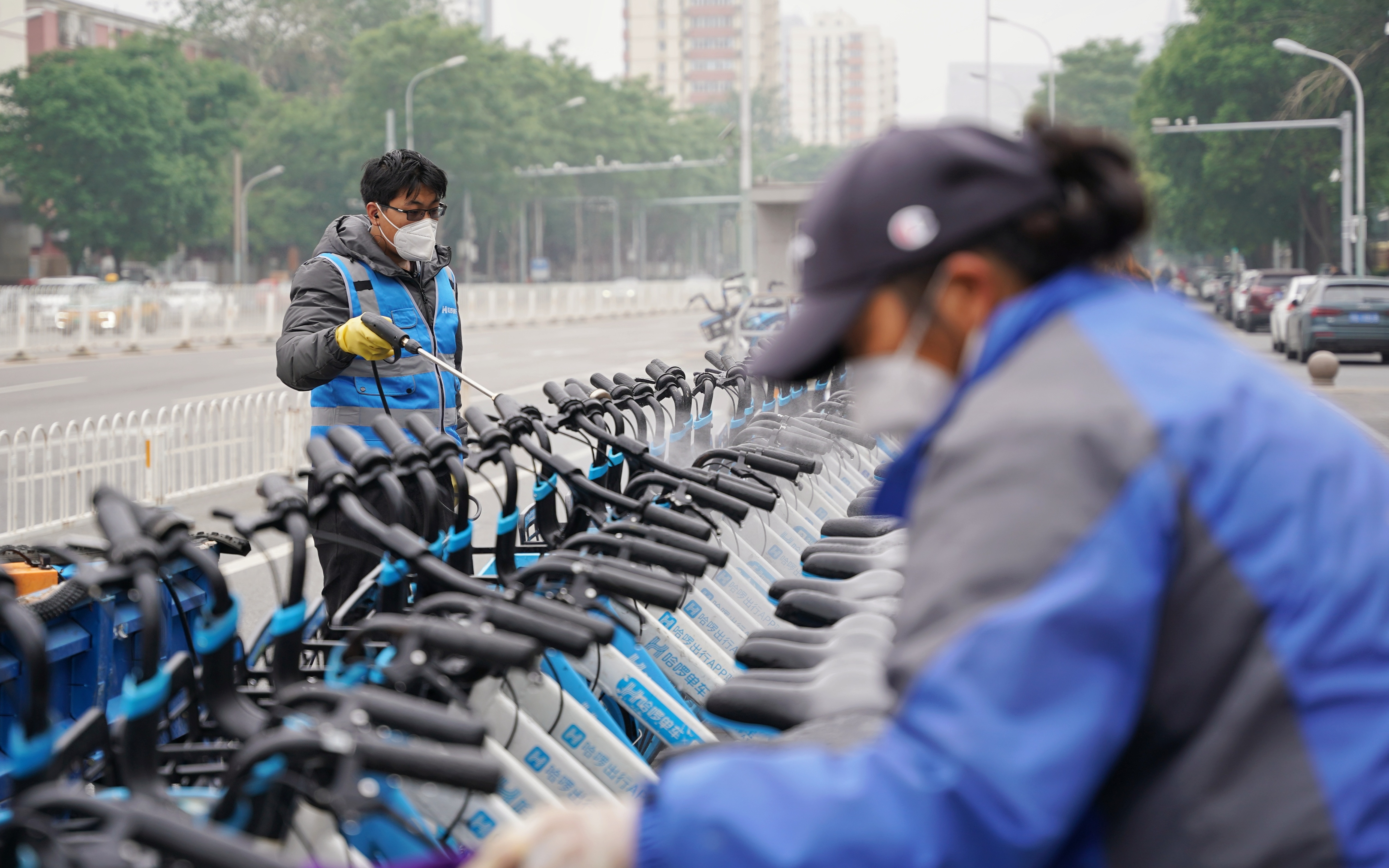 ▲共享单车企业运维人员对车辆进行消毒。新京报记者 王贵彬 摄