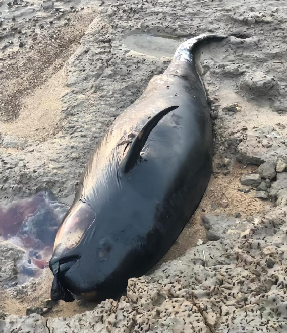 ▲一段网络视频显示,一头已经死亡的江豚躺在湖滩上,头部附近有一摊暗红色的液体疑似血渍,附近有多条死鱼。截图来自社交平台视频