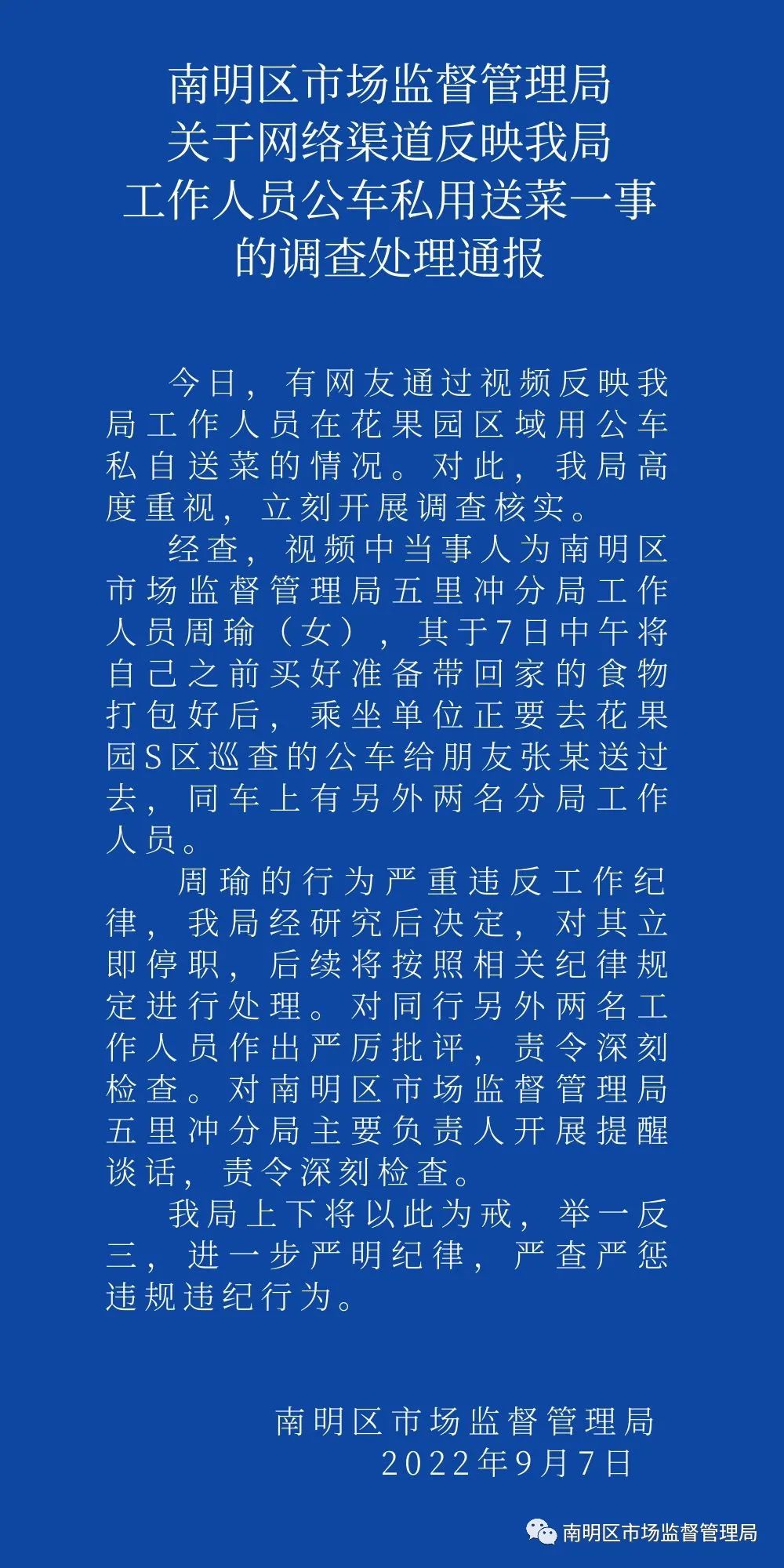 贵阳一公职人员开公车给朋友送菜 官方:停职,约谈主要负责人