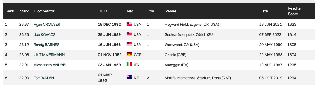 世界男子铅球历史排行榜,克鲁瑟、科瓦茨高居前两名。 世界田联官网截图