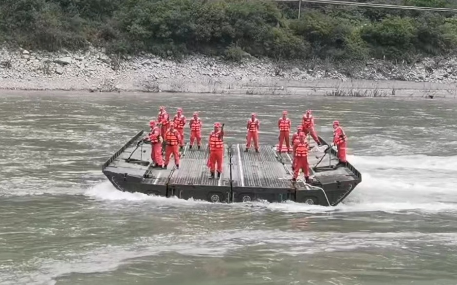 救援前线现场视频显示,在一处广阔的水面上,随着设备成功投放入河,一台长50米、宽8.3米的应急动力舟桥完成局部架设和试运行。穿着橙红色救生衣的救援人员,正操作着舟桥在河流中顺利行进。