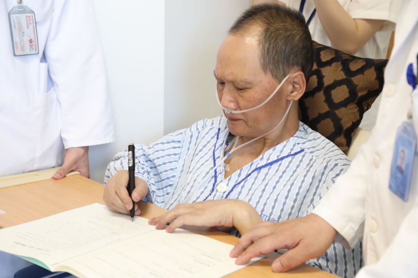 和癌症的这场战斗中,罗盛教节节败退,他已经坐不住了,床头被高高摇起,身后塞着靠垫。但他坚持让自己尽量坐得端正,每句话都努力提着气表达,“我虽然要离开这个世界,但能帮助别人也是好的。”