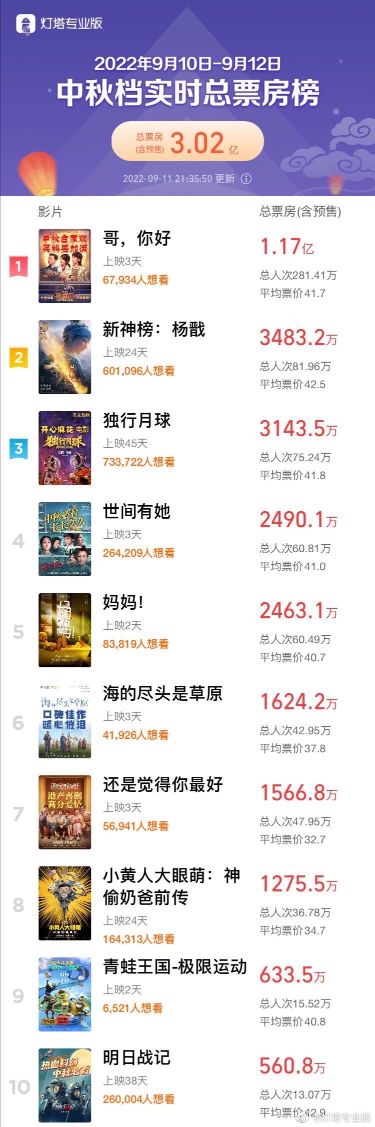 新京报讯 据灯塔专业版数据显示,截至9月11日21时35分,2022中秋档(9月10日-9月12日)总票房突破3亿元(含预售)。