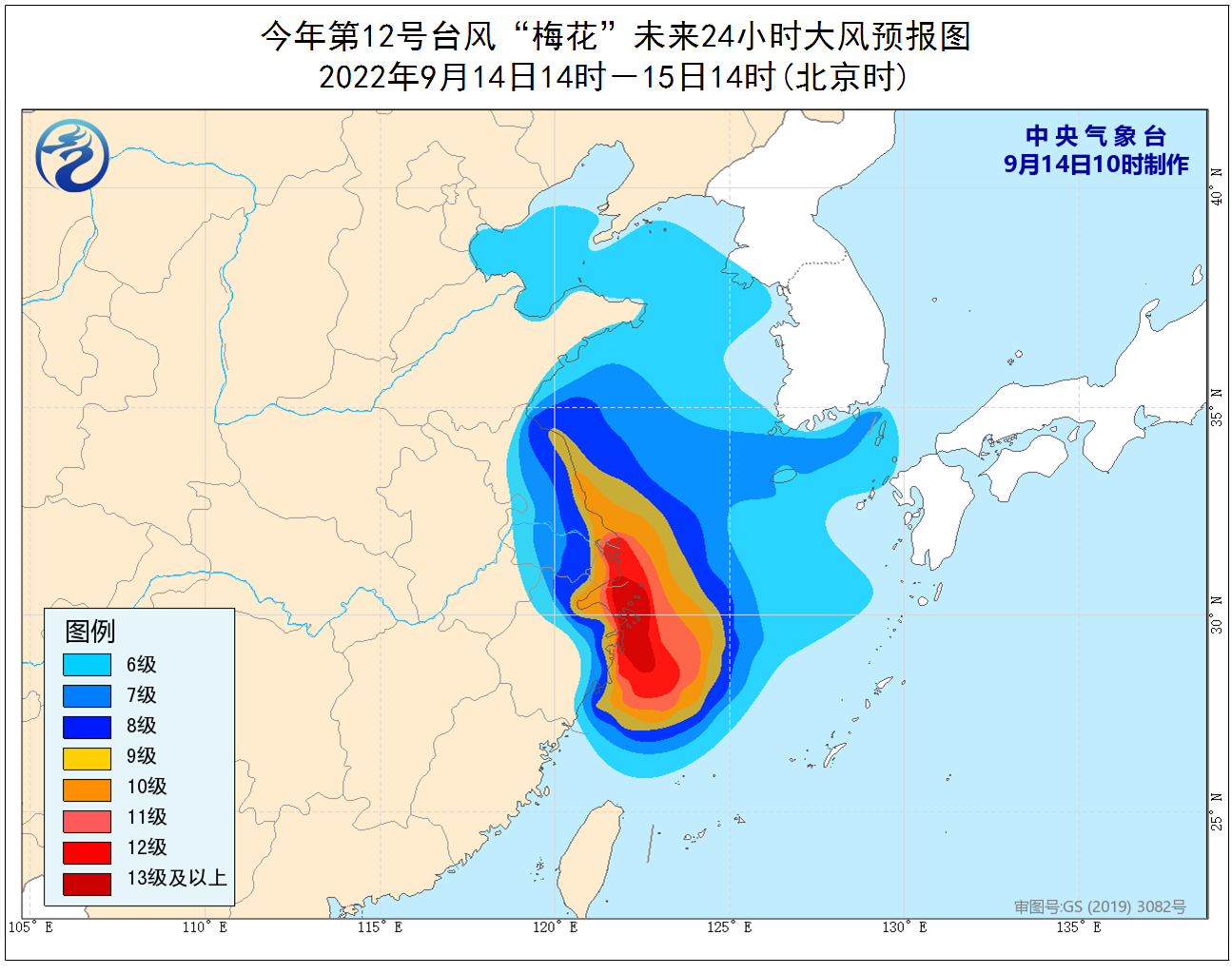 大风预报:9月14日14时至15日14时,东海大部、黄海大部、渤海、渤海海峡、长江口区、杭州湾、福建北部沿海、山东沿海、浙江东部、上海、江苏东部将有6-8级大风,阵风9-11级,其中东海中西部海域、杭州湾、长江口区、浙江中北部沿海、上海沿海、江苏东部沿海将有9-11级大风,阵风12-14级,“梅花”中心经过的附近海面或地区的风力有12-15级,阵风可达16-17级。