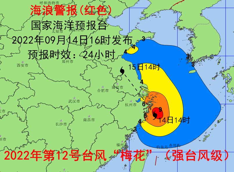 海浪方面,受今年第12号台风“梅花”(强台风级)的影响,预计9月14日夜间至15日白天,东海南部将出现6到10米的狂浪到狂涛区,东海北部、黄海南部将出现3到5米的大浪到巨浪区,近海海域海浪预警级别为橙色;上海、浙江北部近岸海域将出现4到6米的巨浪到狂浪,该近岸海域海浪预警级别为红色,浙江南部、江苏南部、山东南部近岸海域将出现3到4米的大浪到巨浪,该近岸海域海浪预警级别为黄色,江苏北部近岸海域将出现2到3.3米的中浪到大浪,该近岸海域海浪预警级别为蓝色。